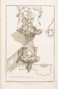 106 planches concernant l’ameublement et la décoration, cheminées, buffets, lits, serrureries… 9 sont dépliantes et représentent des vues du Val de Grâce, des Invalides, de la Sorbonne, de Saint Pierre de Rome, de Saint Paul de Londres, etc.