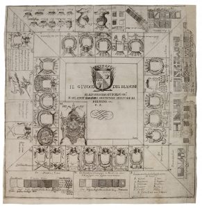 Acquaforte. mm 374X363. Rifilata su tre lati, piccolo margine sul quarto lato. Al centro nel riquadro lo stemma Bentivoglio e l'iscrizione: “IL GIOCO DEL BLASONE /AL ILLUSTRISSIMO ET ECELSO SIG:RE CONTE LORENZO BENTIVOGLI SENATORE DI BOLOGNA/V.s. “; più sotto “G.M.F”. Gioco di dadi didattico, senza penalità, di quaranta caselle, con tavoliere. Si gioca con un dado. L'incisione sembrerebbe derivare il modello da archetipi dì oltralpe. Vi sono indicati con minuziosa cura i colori, gli smalti, le corone, i particolari araldici. Lorenzo Bentivoglio fu senatore dal 1714 al 1718 anno della sua morte e di quella di Mitelli. E' probabile che questo lavoro, non datato, privo delle regole del gioco e con la maggior parte degli stemmi in bianco, sia da considerare incompiuto e fra le ultime cose del Mitelli. R. Buscaroli, Agostino e Giuseppe Maria Mitelli, p.51, n.133; F. Varignana, Le Collezioni d'arte della Cassa di Risparmio in Bologna. Le incisioni. 1, Giuseppe Maria Mitelli, Bologna 1978, cat.560; Costume e società nei giochi a stampa di Giuseppe Maria Mitelli, Perugia 1988, n.2.31, p.139. S. Angelini, I 33 giochi del Mitelli, Grafica Gutenberg Editrice, Bergamo, 1976. Due mancanze sul lato destro reintegrate con carta antica bianca con perdita di parte incisa. Altri minori difetti. Raro.