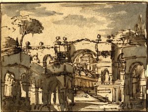 Penna e inchiostro nero acquerellato; carta bianca a vergelle. Foglio: mm 51x76. Supporto: mm 80x85. In basso a destra, manoscritta a penna e inchiostro: “G.B. Piranesi 1781”. Il foglio, la cui “firma”, peraltro vergata in modo tanto nascosto e minuto da essere visibile solo con la lente, non può esser fatta risalire a Piranesi, per ovvi motivi. È forse piuttosto da intendersi some un divertissement compiuto non con l’intento di contraffare ma piuttosto di rendere omaggio al grande maestro, della cui produzione e tecnica il seguace dimostra qui un’approfondita conoscenza e un’ottima perizia grafica. Il piccolo disegno è fissato al supporto cartaceo sottostante per due strisce di carta incollate al verso. Il supporto, su cui è una linea di cornice a penna e inchiostro marrone, è poi incollato a finestra su un cartoncino bianco (sec. XX).