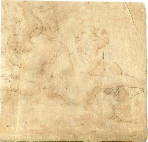 Penna e inchiostro acquerellato; carta bianca a vergelle preparata. Foglio: mm 115x118. Il disegno, molto leggero, è stato chiaramente ritagliato da una composizione più grande. Sul foglio, dal verso, sono presenti tracce di strisce di carta lungo il bordo inferiore, utilizzate per precedenti incollaggi. Sul verso sono anche piccole, diffuse macchie. È parzialmente attaccato al supporto sottostante (cartoncino bianco, sec. XX) dal verso.