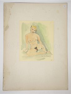 Dessin original en couleur d'une femme nue assise - aquarelle et encre de chine - 21,7 x 25,5 cm - signé