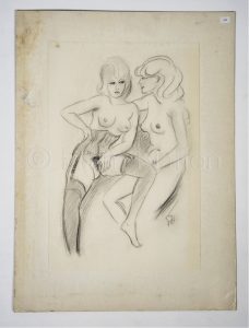 Dessin original représentant deux femmes nues complices - fusain - 27,5 x 41,5 cm - signé GFF