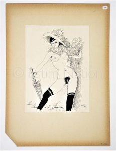 Dessin original " La Plume et la Fourrure " représentant une jeune femme nue avec un chapeau et un parapluie - 1905
