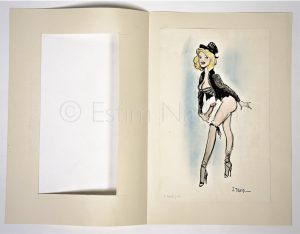Dessin original couleur " Le Boute joie" représentant une femme blonde debout tenant l'objet du désir - encre de chine, aquarelle, crayon bleu - signé - 21,2 x 31,2 cm