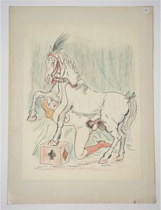 Zoophilie - Dessin original couleur représentant une jeune femme au cirque avec un cheval - crayons de couleur et feutre - 32,6 x 43,5 cm - belle composition
