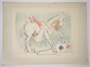 Zoophilie - Dessin original couleur représentant une jeune femme au cirque sous un cheval - crayons de couleur et feutre - 43 x 32,5 cm