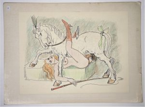 Zoophilie - Dessin original couleur représentant une jeune femme au fouet et au cirque sous un cheval - crayons de couleur et feutre - 43,2 x 32,5 cm