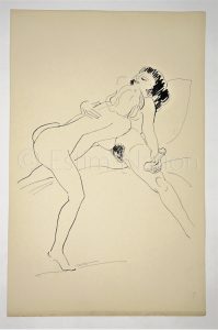 Dessin original représentant deux jeunes femmes nues assises s'activant avec à la main un objet de plaisir - encre de chine noire - 33,2 x 51,2 cm
