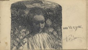 Album oblungo (mm 110x188) rilegato in tela grezza con un timbro a secco, il nome dell’artista e le date scritti sul piatto superiore, laccetto e involucro per la matita, sguardie in carta decorata liberty. Contenente 38 disegni su cartoncino rilegati, alcuni firmati e datati, eseguiti a matita, pastello, inchiostro ed acquarello. Una pagina contiene tre piccole prove xilografiche, probabilmente le prime eseguite dall’artista, sottotitolate da una dedica autografa a penna: “offro le mie prime prove all’amico, Domenico Baccarini”. I soggetti di questo rarissimo taccuino sono vari, dalla ritrattistica al nudo, dai paesaggi agli ornati confermando la personalità originale e poliedrica di Baccarini che spazia, con il tocco poetico che la distingue, dal naturalismo al simbolismo, dal segno divisionista al calligrafismo liberty. Da notare una veduta di via G. Castellani a Faenza, il canale Fossatone, una spiaggia adriatica, studi di fiori e foglie e due progetti di copertine per il libro di versi Flores, un disegno delineato al contrario per l’opera Sensazioni dell’anima, disegni preparatori per xilografie e per il proprio ex libris, dal quale ricavò anche la xilografia Nudino alla balaustra. “Nei primi mesi del 1903 Domenico abbandona con grande amarezza definitivamente Firenze e ritorna a Faenza, dove lavorerà alacremente, intensificando il proprio impegno nella scultura, pittura ad olio, pastello incisione all’acquaforte e nella tecnica xilografica”. S. Dirani, Domenico Baccarini. I taccuini 1902-1903, Faenza 2007, p. 16. Il taccuino è ivi pubblicato e descritto integralmente ai nn. 18, 24, 30, 31, 32, 33, 34, 35, 36, 37, 39, 40, 41, 42, 43, 45, 47, 48, 49, 50, 51, 52, 53, 54, 55, 64, 68, 69, 73, 74, 75, 76, 77, 78, 79, 80, 81, 97. La copertina è riprodotta a p. 15.
