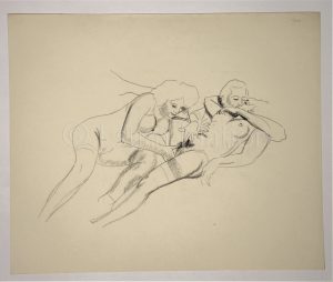 Triolisme - Dessin original représentant trois personnes couchées - fusain - 40 x 33 cm