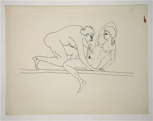 Dessin original représentant un homme en attente et une femme - Style grec ancien - feutre - 32,5 x 25 cm