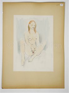 Dessin original en couleur représentant une jeune femme nue les jambes écartées et se touchant - aquarelle et mine de plomb - 24,9 x 35 cm
