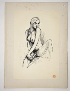Dessin original représentant une jeune femme nue assise s'introduisant un objet - encre de chine - signé E.R.-