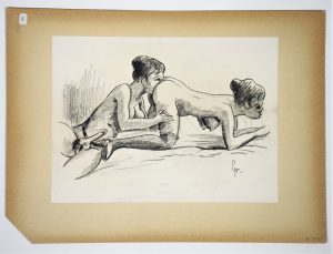 Dessin original représentant deux femmes nues bien occupées - fusain - 38 x 28 cm - signé GV (Georges Villard au dos)