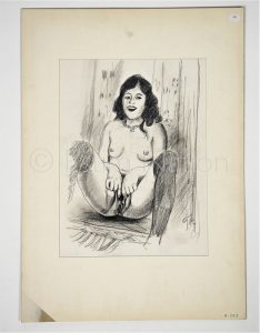 Dessin original représentant une femme nue souriante - fusain - 28 x 38 cm - signé GV (Georges Villard )