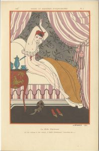 3 pochoirs. mm 208x145; 275x180 cad. Firmati e datati in basso a destra. Ognuno reca in basso il titolo seguito da dei versi. Rispettivamente numerati: Pl. I, III, VII. Edizione di 300 esemplari. Il periodico illustrato “Mode et manieres d’aujourd’hui”, assieme al “Journal des Dame et des Modes” e alla “Gazette du Bon Ton”, fu una delle pubblicazioni di moda a maggior tasso di innovazione e sofisticazione che fossero prodotte in Francia nel periodo Déco, potendo vantare prestigiose collaborazioni con artisti capaci di realizzare favolose immagini colorate a pochoir. Tale tecnica grafica di origine giapponese, eseguita a mano, consentiva di dipingere in serie disegni già stampati grazie a sottili lamine di zinco usate come “mascherine” (una per ogni colore). Nell’immaginario collettivo a questa rivista francese, tirata in sole 300 copie, resta legato soprattutto il nome del sommo illustratore George Barbier, a cui si deve tra l’altro la celeberrima immagine della pantera nera simbolo della maison Cartier. A lui nel 2008 il Museo Fortuny di Venezia ha dedicato una pregevole esposizione che ben ne sottolineava l’estrema versatilità professionale, la dimestichezza con le tecniche più svariate, i legami con le avanguardie, la “polifonia” creativa che lo vide artefice anche di abiti di moda, costumi teatrali, ventagli, gioielli, tessuti e molto altro. Cfr. S. Alligo, Modes et manières d'aujourd'hui, introduzione di G. Ercoli, Torino 2011. Ottima conservazione.