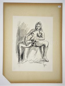 Dessin original représentant une femme nue assise et prête à l'introduction - 26,8 x 36,5 cm - signé GV (Georges Villard au dos)