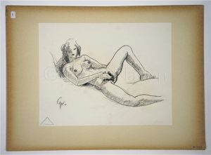 Dessin original représentant une femme nue allongée sur le dos se caressant - fusain - 36 x 28 cm - signé GV (Georges Villard au dos)