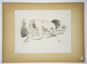 Dessin original représentant une femmes nue agenouillée en train de lire - fusain - 36,5 x 28 cm - signé GV. (Georges Villard)