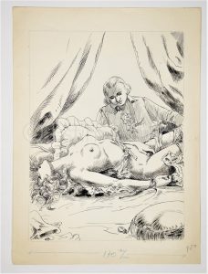 Dessin original représentant un gentilhomme et une femme lascive - genre dessin du XVIIIè siècle - encre de chine - 24 x 33 cm - Ce dessin et les suivants ont été réalisés dans les années 1980 pour des revues érotiques éditées à Paris.