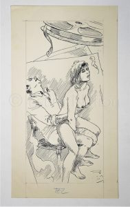 Dessin original représentant un couple assis faisant l'amour - décor lié au cinéma - encre de chine - 15,2 x 27,2 cm -