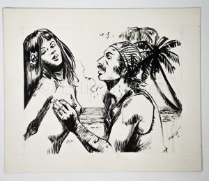 Dessin original représentant une jeune femme jouissant sous les doigts d'un homme debout - paysage d'une île - encre de chine - 21,1 x 17,6 cm - sur carton fort