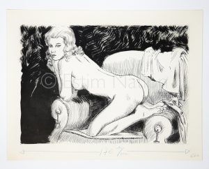 Dessin original représentant une jeune femme nue agenouillée sur un fauteuil - encre de chine - 21 x 27 cm - sur carton fort
