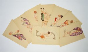 Ensemble de 21 dessins originaux érotiques d'un répertoire des positions hétéro et homosexuelles en situations explicites - aquarelle couleur et gouache blanche - réalisés peut être pour un ouvrage non identifié - 15 x 25 cm environ