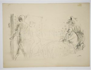 Reproduction d'un dessin représentant un homme couché regardant partir deux hommes - signé - 28,2 x 38 cm - circa 1926
