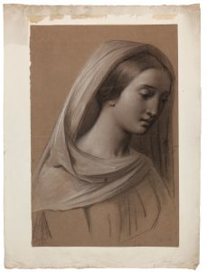 Carboncino, matita nera e rialzi a matita bianca; carta marrone. mm 505x335. Iscritto “Bertini” in basso a sinistra. Allievo di Luigi Sabatelli e Giuseppe Bisi, influenzato da Hayez, si orientò alla pittura romantica e verista. Fu docente e direttore dell'Accademia di Belle Arti di Brera di Milano e primo direttore e amministratore del Museo Poldi Pezzoli di Milano. Parzialmente incollato su un supporto di carta bianca filigranata “PM”. Due strappi laterali richiusi.