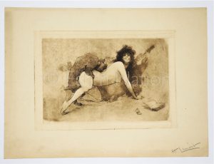 Gravure représentant une femme jouant avec un chien - 30,6 x 22,6 cm - signée H. LEMART