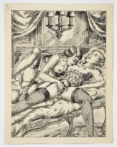 Saphisme - illustration représentant une scène de sexe entre deux femmes - 16 x 20,6 cm