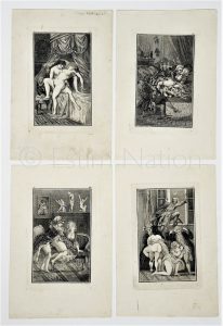 Ensemble de 4 gravures représentant des scènes de sexe - issues de l'ouvrage "Mon noviciat ou les joies de Lolotte " de ANDREA de NERCIAT (1739-1800) paru initialement en 1792 et réédité au XIXème siècle à Paris - 4 x 11,7 x 17,4 cm