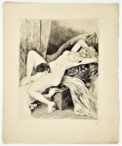 Gravure représentant une scène de sexe de cunnilingus - de l'ouvrage dont est issue l'illustration - signée JC ou LC - 21,5 x 26,5 cm