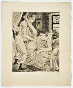 Gravure représentant une scène de sexe d'un couple sur un fauteuil - n°12 de l'ouvrage dont est issue l'illustration - signée JC ou LC - 22 x 26,5 cm
