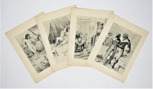 Ensemble de 4 reproductions de ses fusains noirs pour un livre érotique se passant sous la Révolution - 14 x 18,8 cm env.