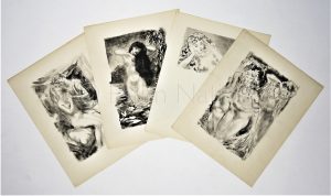 Ensemble de 4 reproductions de belles gravures pour un livre érotique - 14,1 x 22,3 cm - signé B.A.