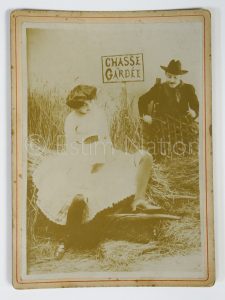 Ensemble " Chasse gardée " de 7 photographies porno en intérieur - Tirage argentique en noir et blanc d'époque - circa années 1930 - 13,5 x 18,4 cm - collées sur le carton épais du studio - les photos ont un peu "virées".