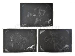 Photographie érotique - Ensemble de 3 négatifs photographiques sur plaques de verre de dessins ayant servis à la production d'un ouvrage érotique peut être de COLLOT: le mari, la jeune fille et le sadique - 9 x 12 cm - avec emballage d'origine - érotique et scènes explicites d'intérieur