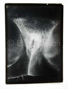 Photographie érotique - 1 négatif photographique sur plaques de verre (cassée au coin droit) - début XXème siècle - ayant servis à la production de tirage argentique sur papier, de cartes postales ou à l'usage privée ou éditorial - 12,9 x 17,8 cm - sans emballage d'origine - représentant le sexe d'une femme en gros plan - avec 7 tirages papier noir et blanc au format