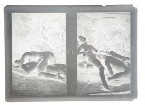 Photographie érotique - Ensemble de 5 négatifs photographiques de 2 photos sur plaques de verre (2 de scène vivante et 6 de reproduction de dessins dans un ouvrage ) - XXème siècle - ayant servis à la production de tirage argentique sur papier, de cartes postales ou à l'usage privée ou éditorial - chaque plaque env. 12,9 x 17,8 cm - sans emballage d'origine - scènes explicites de triolisme -