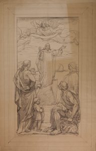 Matita nera e riquadratura a penna; carta avana. mm 790x500. Probabile bozzetto per bassorilievo proveniente dagli archivi delle maestranze artigiane del marmo di Pietrasanta. Scultore e pittore figlio Amos, G. Cassioli è l'autore della porta bronzea di destra della Cattedrale di Santa Maria del Fiore a Firenze: l'opera fu così sofferta, avendo l'artista subìto nei lunghi anni di lavoro critiche, vessazioni, disgrazie e miseria, che nel porre un suo autoritratto in una delle testine del battente destro, si ritrasse soffocato da una serpe.