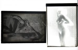 Photographie érotique - Ensemble de 4 négatifs photographiques sur plaques de verre - début XXème siècle - ayant servis à la production de tirage argentique sur papier, de cartes postales ou à l'usage privée ou éditorial - chaque plaque env. 13 x 18 cm - scènes fellation et autres - avec 19 tirages papier au format