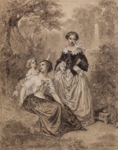 Penna, inchiostro bistro acquerellato e rialzi a biacca. mm 340x265. Firmato e datato in basso a destra: “Amédée Charpentier 1855”. Disegno finito, probabilmente destinato alla trasposizione litografica. L'artista fu litografo e pittore, entrò all'école des Beaux-Arts nel 1840 ed espose ai Salon dal 1852 al 1879; domiciliato a Parigi 23 rue Génégaud, marito di Victoire Bosio, figlia dello scultore Bosio. Rinforzi di carta al verso lungo il margine destro, applicato con due linguette a un vecchio cartoncino decorato. Per il resto ottima conservazione.