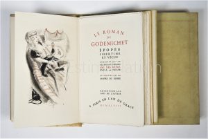 Le Roman de godemichet. Épopée libertine et vécue composée par un descendant d’Hermès Ami des muses Emule de Priape et illustrée par un maître du genre. A Paris en l'an de grace MCMXLVIII - Edité pour les amis de l’auteur - 1948 -14,2 x 23 cm - En cahiers non reliés, couverture rempliée, chemise et emboitage - Exemplaire n°9 sur un tirage de 200 ex.