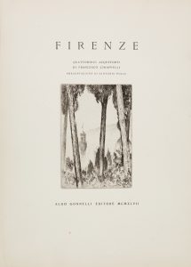 Cartella in-folio (mm 490x345). Carte [3], di cui 2 con la presentazione di G. Poggi e 1 con indice delle 14 acqueforti contenute nel portfolio a fogli sciolti tutte firmate, numerate e titolate, oltre a 1 frontespizio inciso (veduta di Firenze dal giardino di Boboli) e [1] finale di colophon: “Di queste acqueforti sono state stampate dal Maestro Gino Tarchiani dell'Istituto d'Arte di Firenze 75 esemplari su carta di china numerati da 1 a 75, e 175 esemplari su carta avorio numerati da 76 a 250”. Es. n. 83. Legatura in mezza tela, piatti in cartone. POGLIAGHI-CHIAPPELLI, p. 59 e segg. Ottimo esemplare.