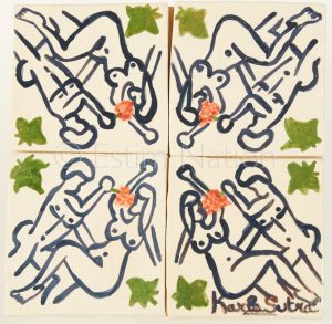 Oeuvre originale composée de 4 carreaux de faïence émaillés faits main montés sur pièce de bois de sapin - Signé.