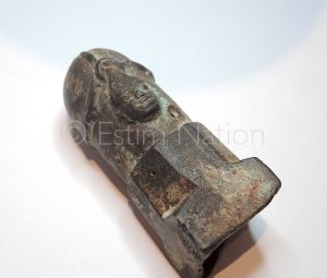 Manche d'outil (?) en bronze figurant un phallus et un masque. Travail ancien dans le goût antique.