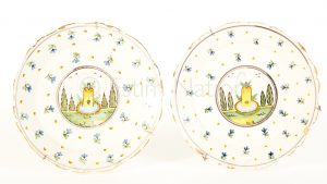 Paire d'assiettes en faïence de Nevers à décor d'une fontaine "facétieuse". Epoque 18ème siècle.