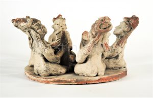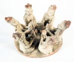 Groupe en terre cuite polychrome représentant une réunion de femmes chacune un phallus à la main. Travail mexicain.